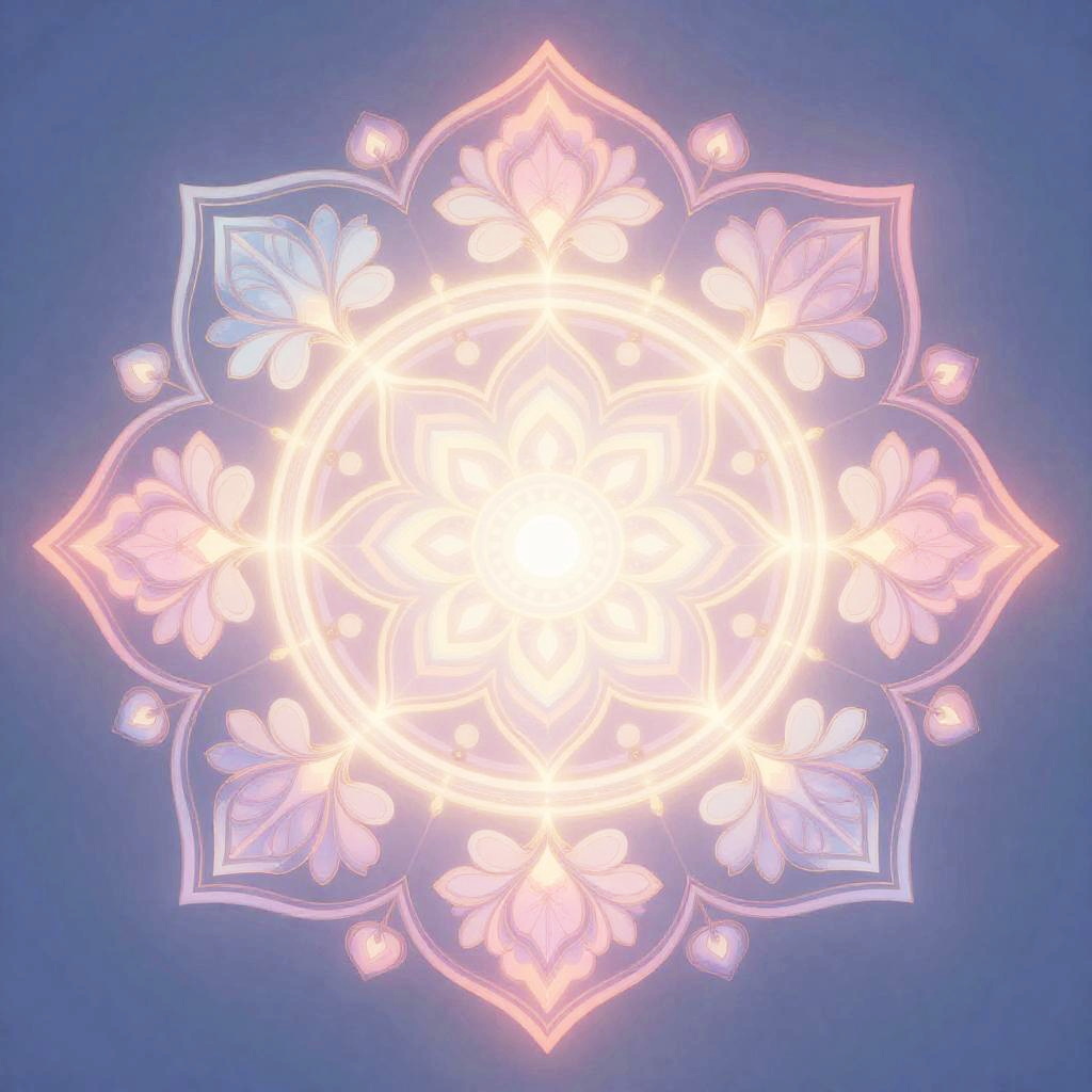 A digital mandala generated by AI, featuring detailed floral and geometric motifs with radiant pastel colors, glowing softly in a serene, meditative composition, blending traditional Eastern art styles with futuristic digital effects and smooth gradients.