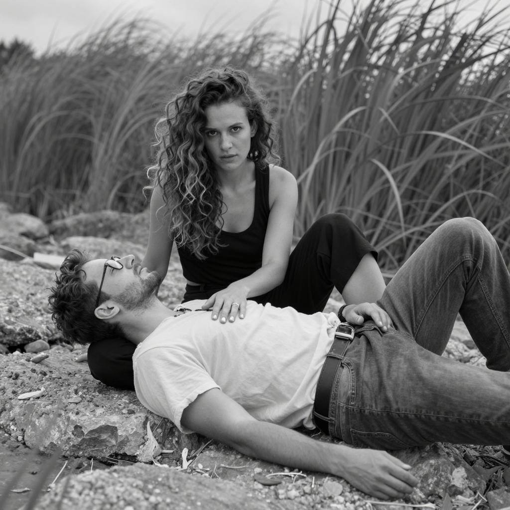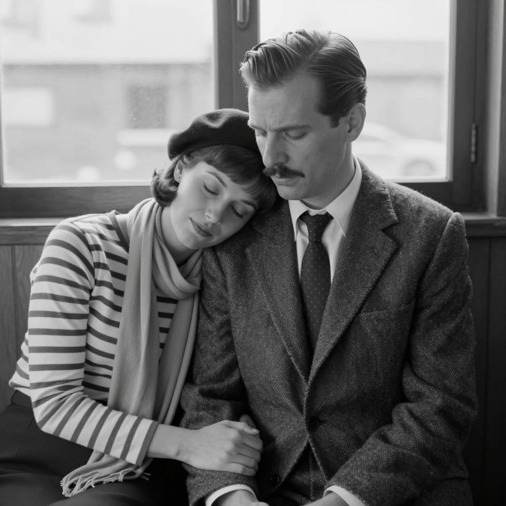 Man in a suit and fedora sits on a wooden plank, looking down. Woman in a striped top and long skirt lies diagonally across the plank, resting her head on his shoulder. She has short, curly hair and a relaxed expression. Wooden plank and blue background. Both wear formal attire. Woman's legs extend over the plank, feet in black shoes. Man's left hand rests on his lap, right hand on the plank. Simple, minimalistic composition.