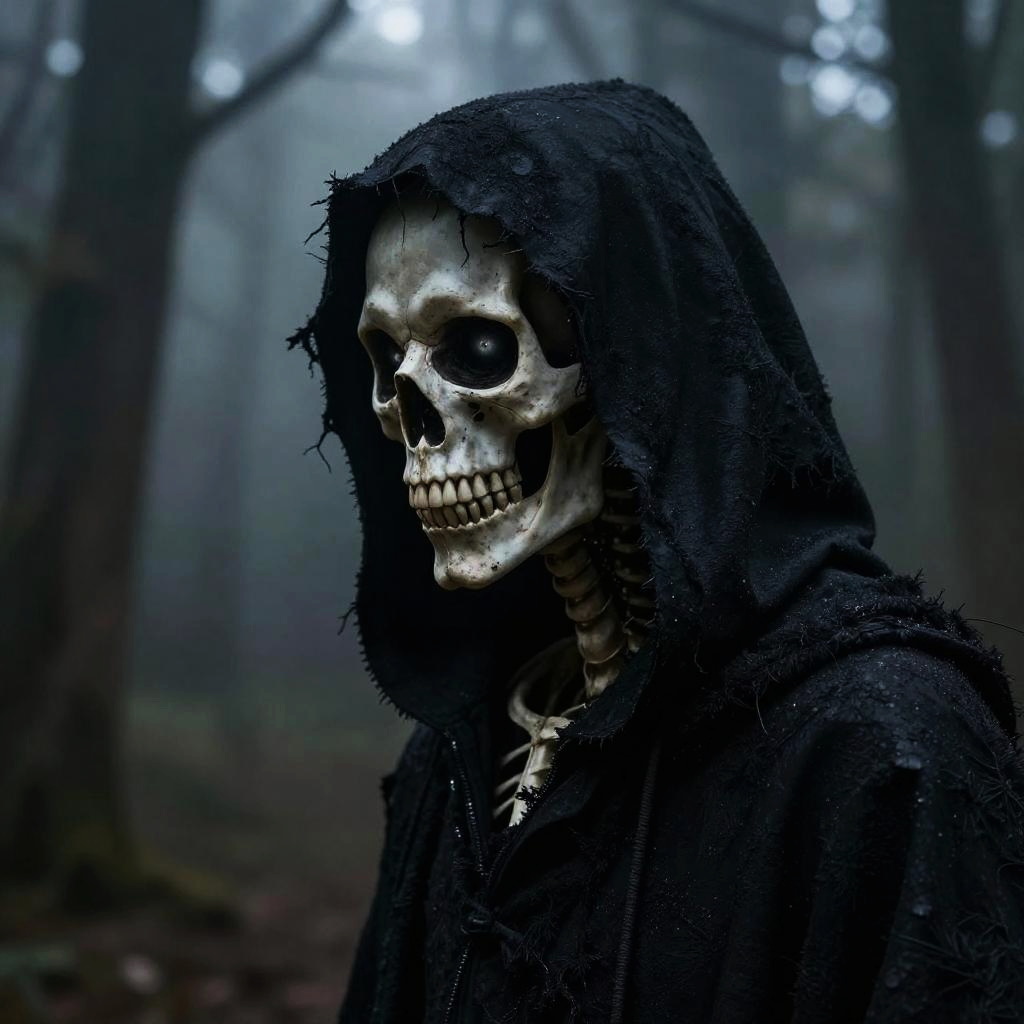 Grim reaper side profile portrait in a dark, misty forest, glowing eyes under a tattered black hood, detailed skeletal features, eerie atmosphere, high contrast lighting