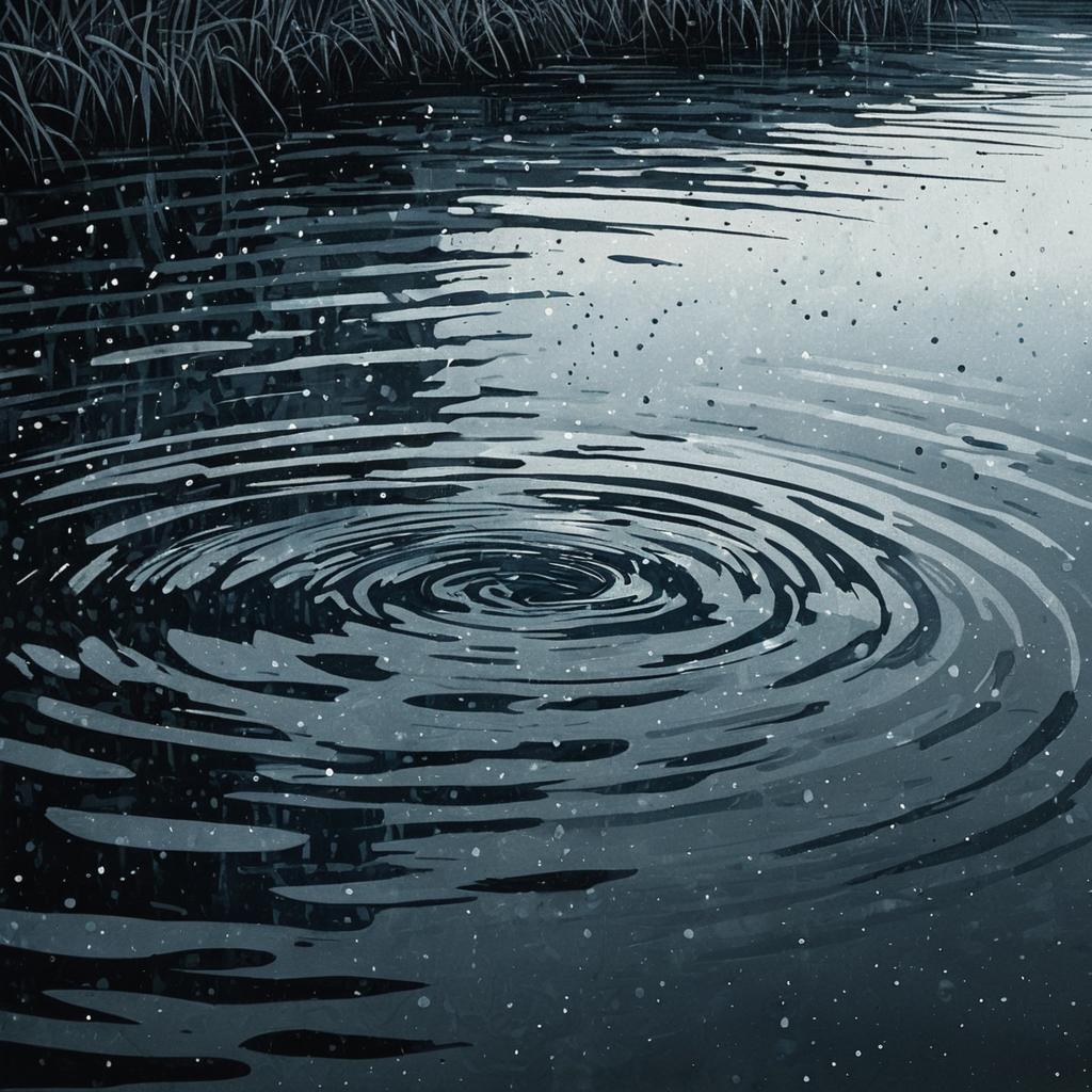 Digital painting depicting intense emotional expression of heartbreak and sorrow. Muted gray and blue tones create a somber atmosphere with shimmering water reflections and concentric ripples on a dark water surface. High-quality illustration conveying deep, intense emotions with abstract natural elements.