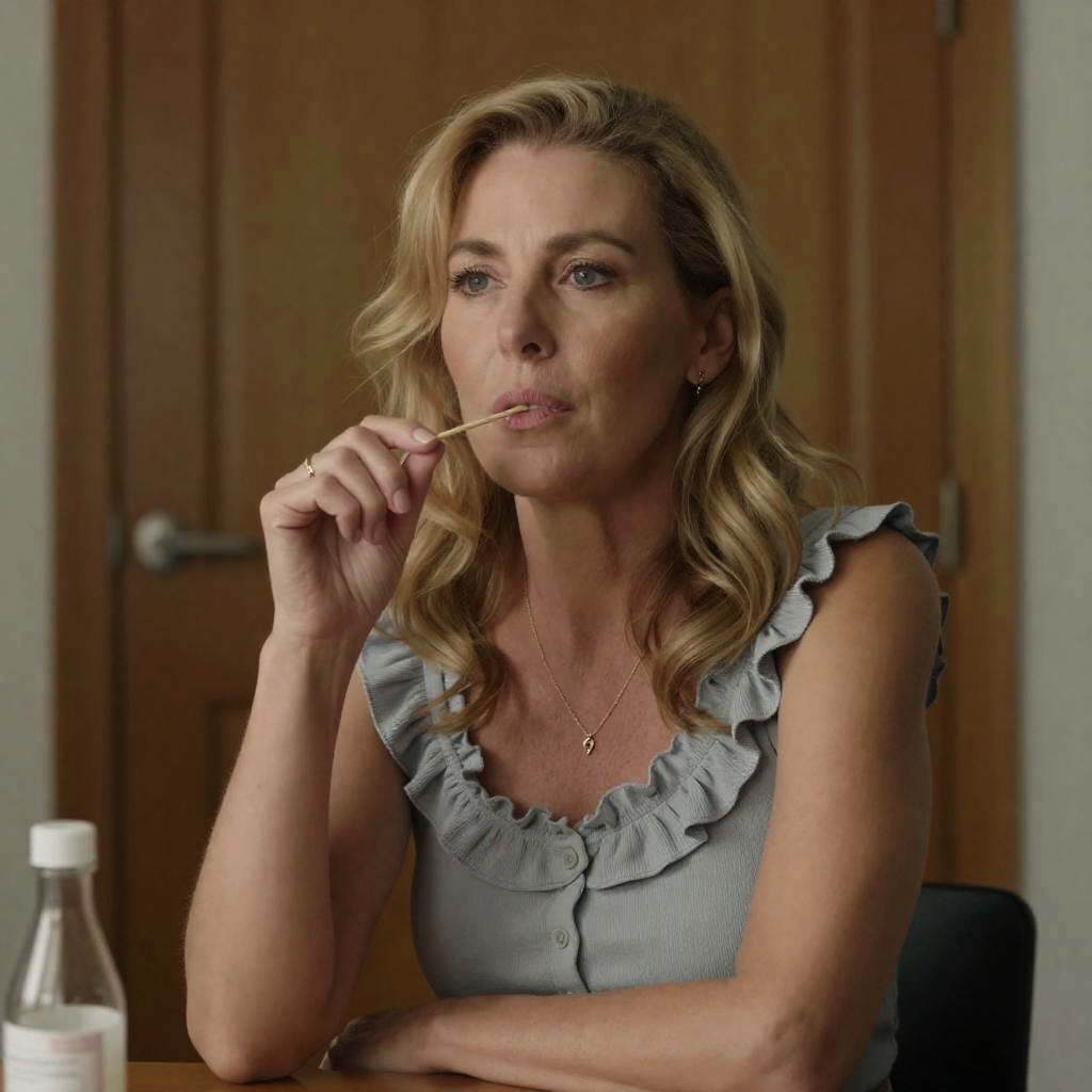 Photograph of a middle-aged woman with long, blonde hair and a white lace camisole, sitting on a bed. Her right hand rests on her chest, left hand on her thigh. A shirtless man with a tattoo on his arm lies behind her, partially covered by a red and white checkered blanket. Dimly lit, wooden paneled room. Woman's expression is neutral, man's face not visible.