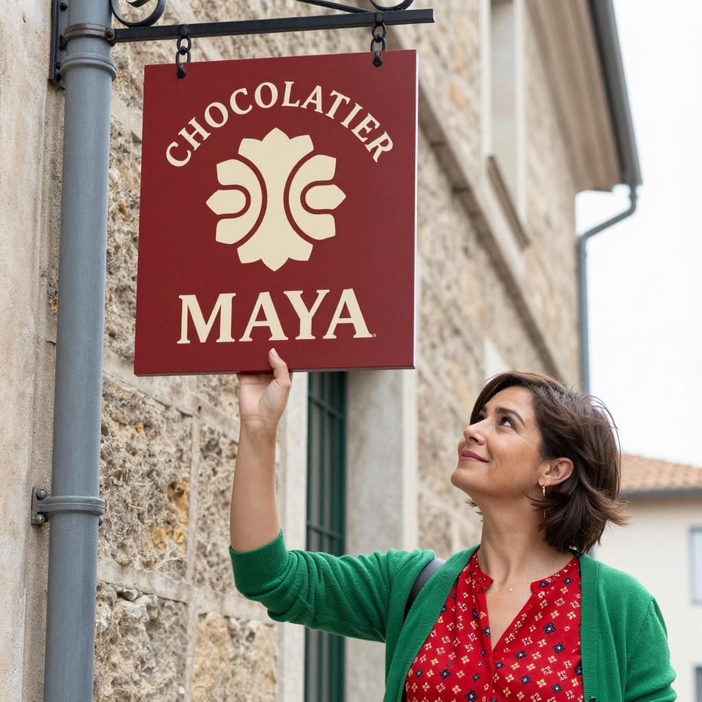 Woman with short brown hair, wearing a green cardigan and red patterned blouse, holding a red sign with "CHOCOLATIER MAYA" and a cream-colored emblem. Sign attached to a stone wall with a blue pipe on the left. Woman smiling slightly, looking up. Sign hangs from a black metal bracket. Bright outdoor light.