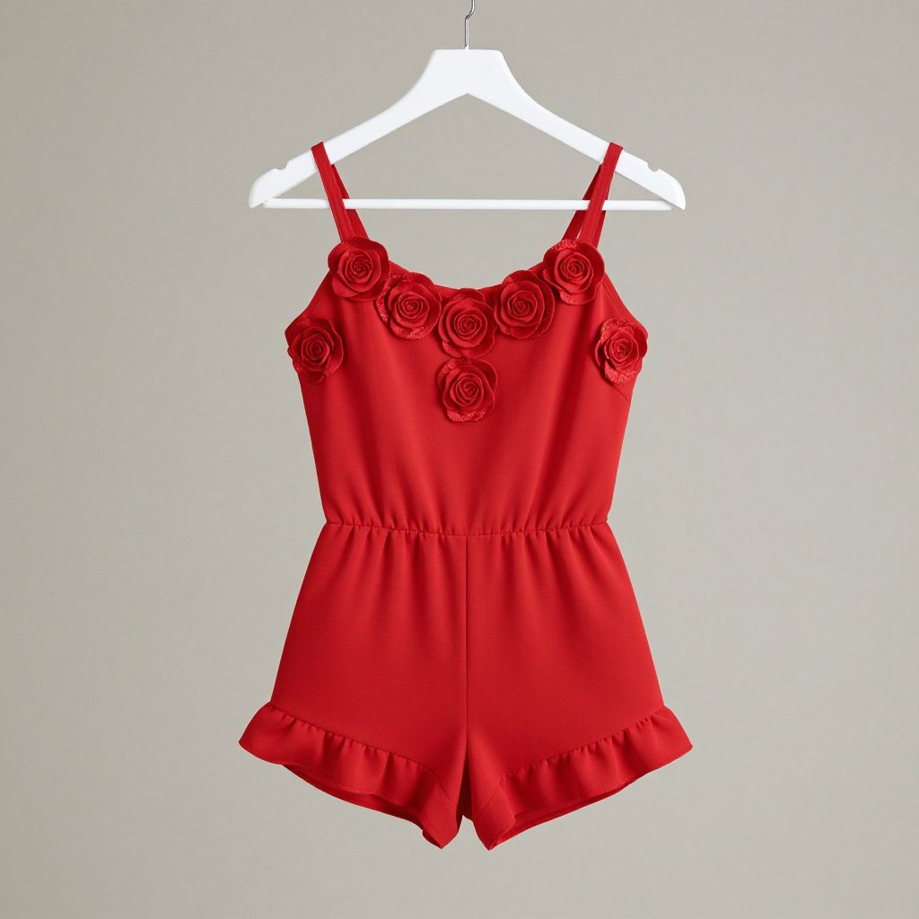 Photograph of a vibrant red, sleeveless romper with rose embellishments on the bodice, hanging on a white hanger against a plain gray