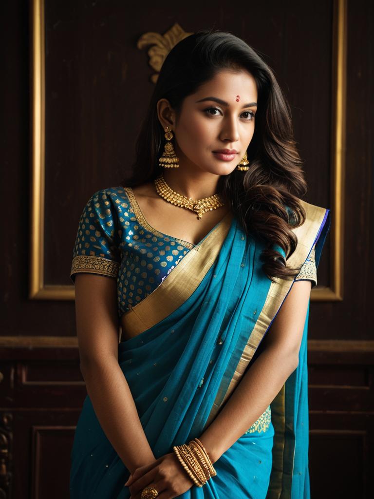 Half Saree Cerulean, anusha in a blue sari and gold blouse --sref 1391