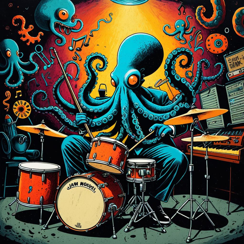 Lowbrow art style digital artwork featuring a bear surfing on a gigantic stylized wave. The wave includes vibrant, funky colors with intricate patterns reminiscent of Jeff Koons and Yayoi Kusama influences. The scene is set on a sunny beach with surreal and whimsical atmosphere, detailed textures, and humorous elements.