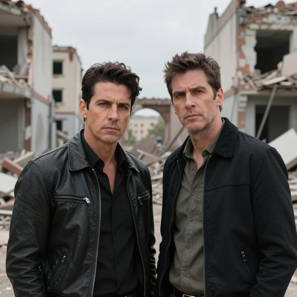 Two men standing outside under a blue canopy. Black man on left with dark skin, bald, wearing gray jacket over white shirt. White man on right with dark hair, blue shirt, black vest, tan pants. Background includes mountains, fence, and construction cones. Both men have serious expressions. Sunlight casts shadows.