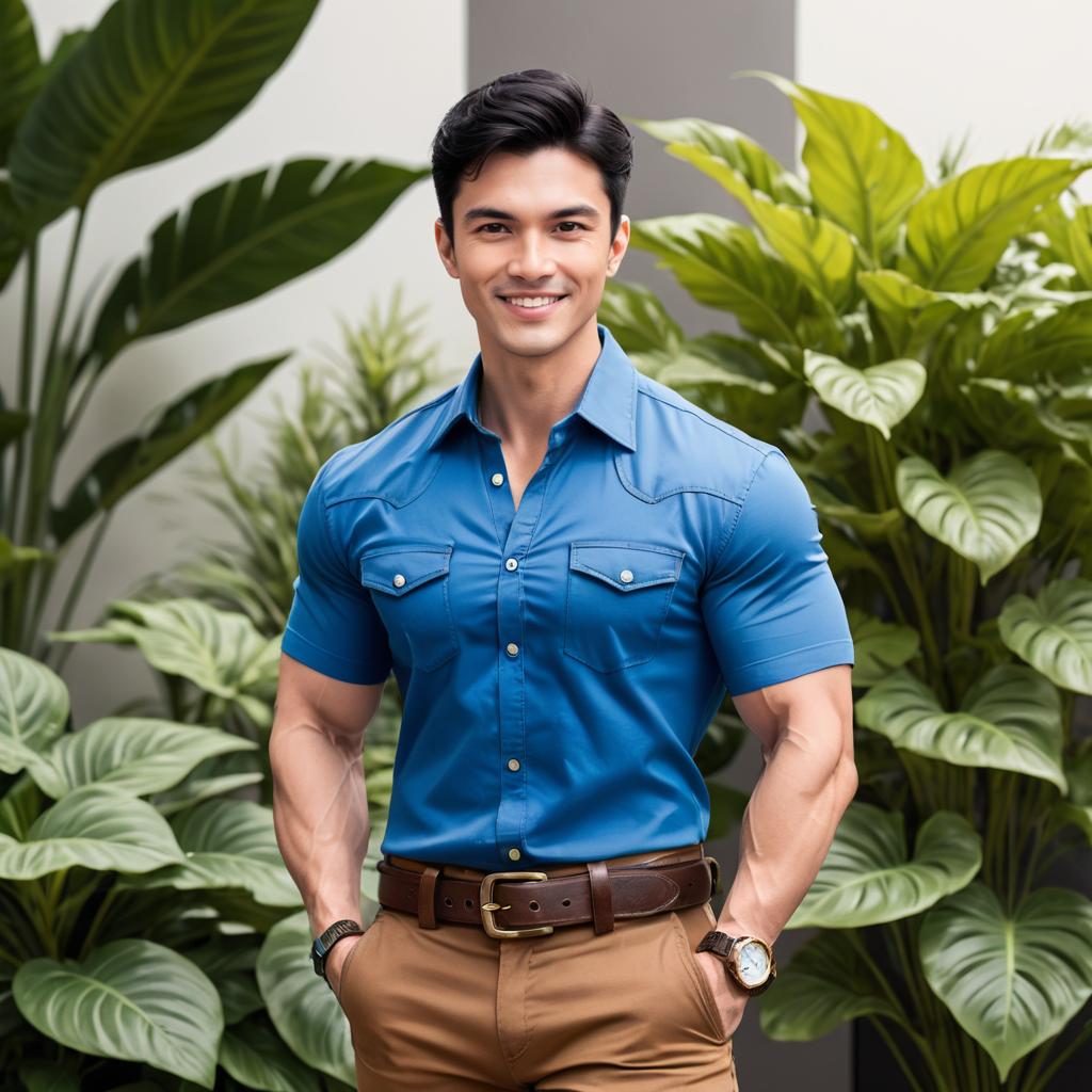 A confident young man wearing a blue button-up shirt and beige pants stands outdoors with hands in pockets. He is smiling and positioned next to lush green plants in a garden setting.