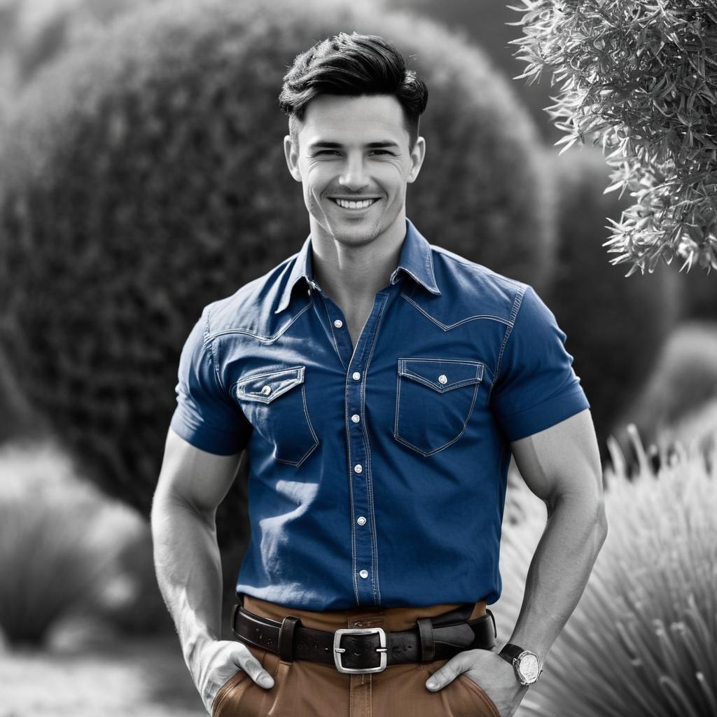 1boy, male focus, solo, shirt, watch, pants, wristwatch, brown pants, belt, blue shirt, traditional media, black hair, looking at viewer, short hair, hands in pockets, plant, closed mouth, muscular, t-shirt, pectorals, muscular male, cowboy shot, smile, monochrome, standing