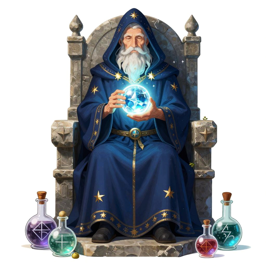 Old school wizard art featuring a mystical elder cloaked in deep blue robes adorned with golden stars, seated on a throne of ancient stone, holding a crystal orb radiating light, with alchemical symbols and potion bottles scattered around.