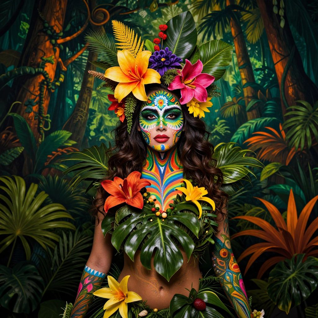 Vibrant digital portrait of a woman in jungle-themed face paint and floral headgear, adorned with large colorful flowers and leaves, standing amidst lush,