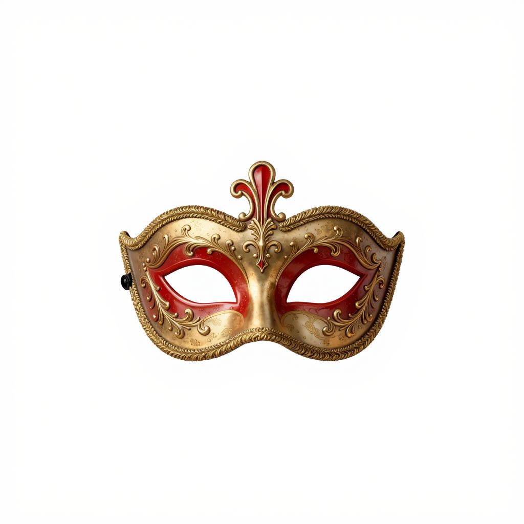 An exquisite illustration of Venetian carnival mask, crafted in baroque engraved style with crimson and antique gold highlights, set against a vast white negative space, UHD, 16K, ultra-detailed.