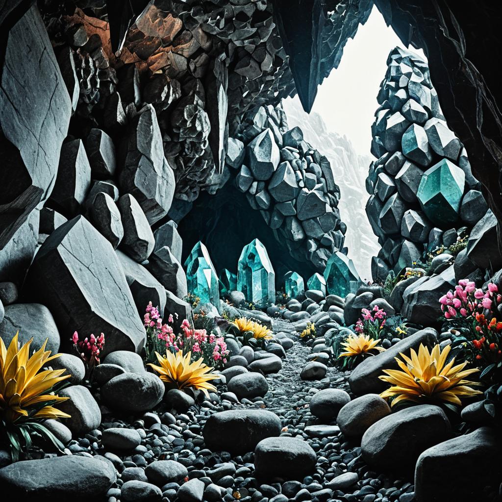 A digital art depiction of a cave entrance framed by large, jagged boulders shaped like rock golem skulls. The pathway leading into the dark cave is bordered by vibrant clusters of orange tulips and various other colorful flowers, contrasted against the grey stones and boulders. The scene evokes a mystical, fantasy atmosphere.