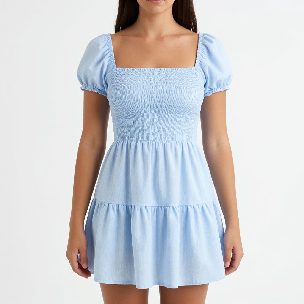 "Woman, youthful casual, short puffed sleeve mini dress in pale blue, square neckline, shirred bodice, tiered skirt, light cotton fabric with subtle stripe pattern, plain white background.. Sexy. Pretty face and beаutiful eyes. Big breasts."
