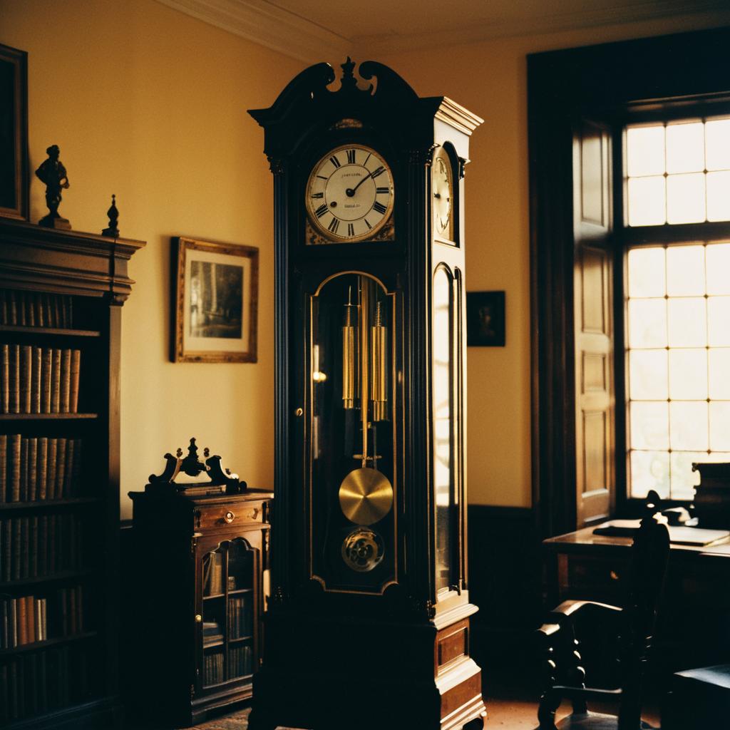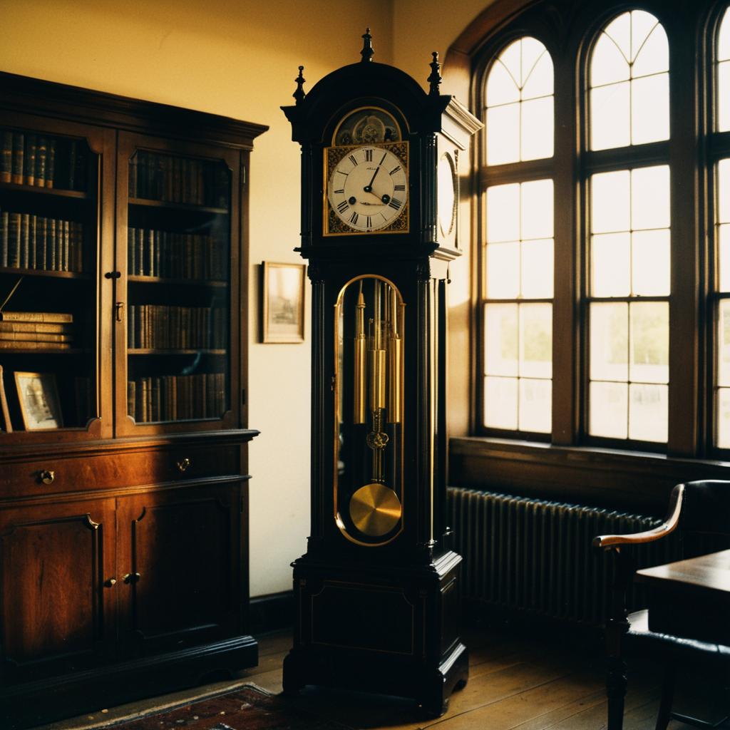 Fujifilm Pro 400H cinematic film still of grandfather clock parked in antique study room during golden hour.