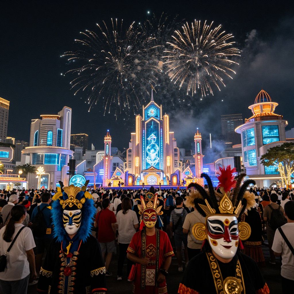 Societ vibrant festival in a futuristic city square, crowds wearing elaborate masks and costumes, dazzling light displays and fireworks illuminating night sky, blending traditional cultural motifs with advanced technology in a lively and dynamic composition.