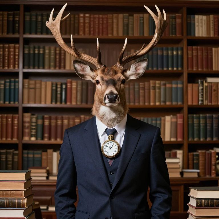 Photograph of a humanoid deer with a large set of antlers, dressed in a dark navy suit with a white shirt and black tie, standing in front of a wooden bookshelf filled with variously colored books. The deer's face is centered, with a watch chain hanging from its neck. Stacks of books are on either side of the deer. The background is well-lit, highlighting the rich wood tones and the detailed spines of the books, creating a formal, scholarly atmosphere. The image has a surreal, fantastical quality.