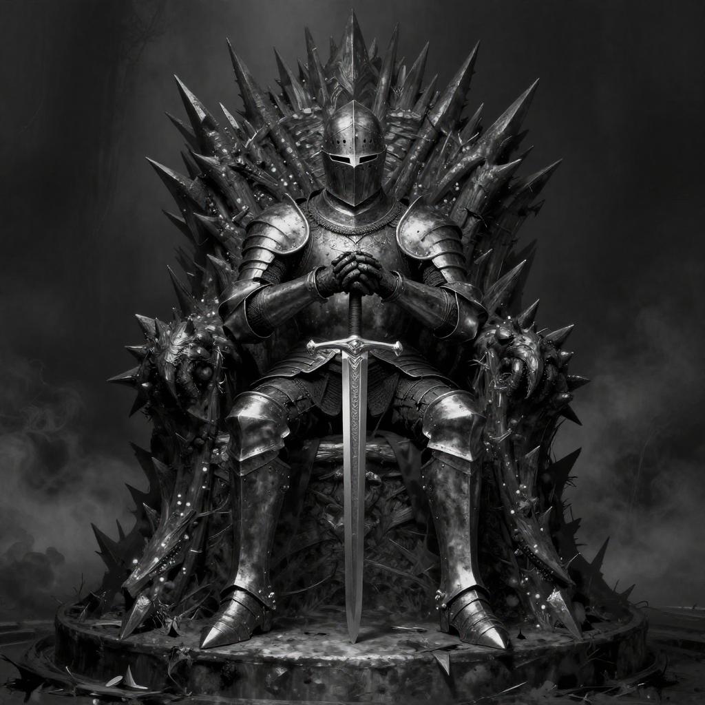 Black-and-white dark fantasy portrait of a forsaken knight clad in intricate armor, seated on a large, spiked throne made of ash. The atmosphere is heavy and ominous with a void of despair in the background, evoking a melancholy and dark metal aesthetic. The knight's posture is solemn, with hands resting on a sword, set on a circular platform surrounded by shadows and smoke.