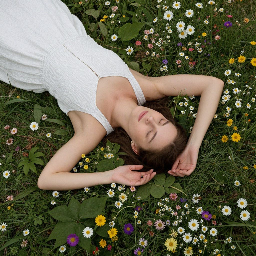 Photograph of a young woman with fair skin and dark brown hair lying on her back in a grassy field filled with colorful wildflowers. She wears a white, sleeveless, textured dress and has her eyes closed, arms resting above her head. Surrounding her are white daisies, yellow marigolds, purple violets, and green leaves, creating a vibrant and serene natural setting. The image has a soft, natural light, enhancing the tranquil and peaceful atmosphere.