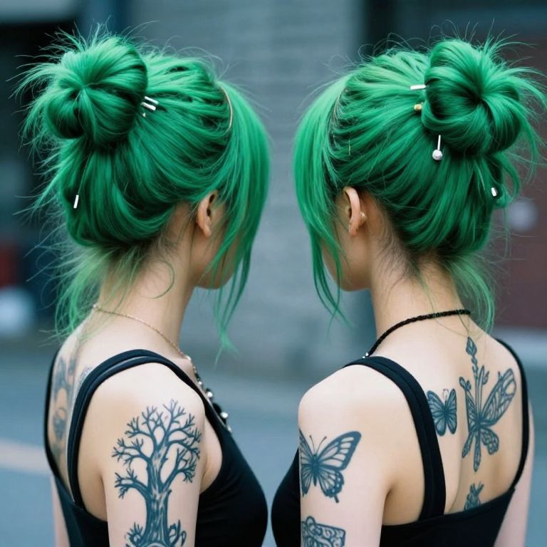 Photograph of two women with vibrant green hair in messy buns, viewed from the back. Both wear black sleeveless tops, revealing intricate back tattoos: one with a tree and butterfly, the other with detailed butterflies. Their pale skin contrasts with the dark ink and bright hair. The background is blurred, featuring a grey building and a street, suggesting an urban setting. The women's hair has small white hairpins, adding a subtle touch. The image has a realistic style, with sharp details and natural lighting.