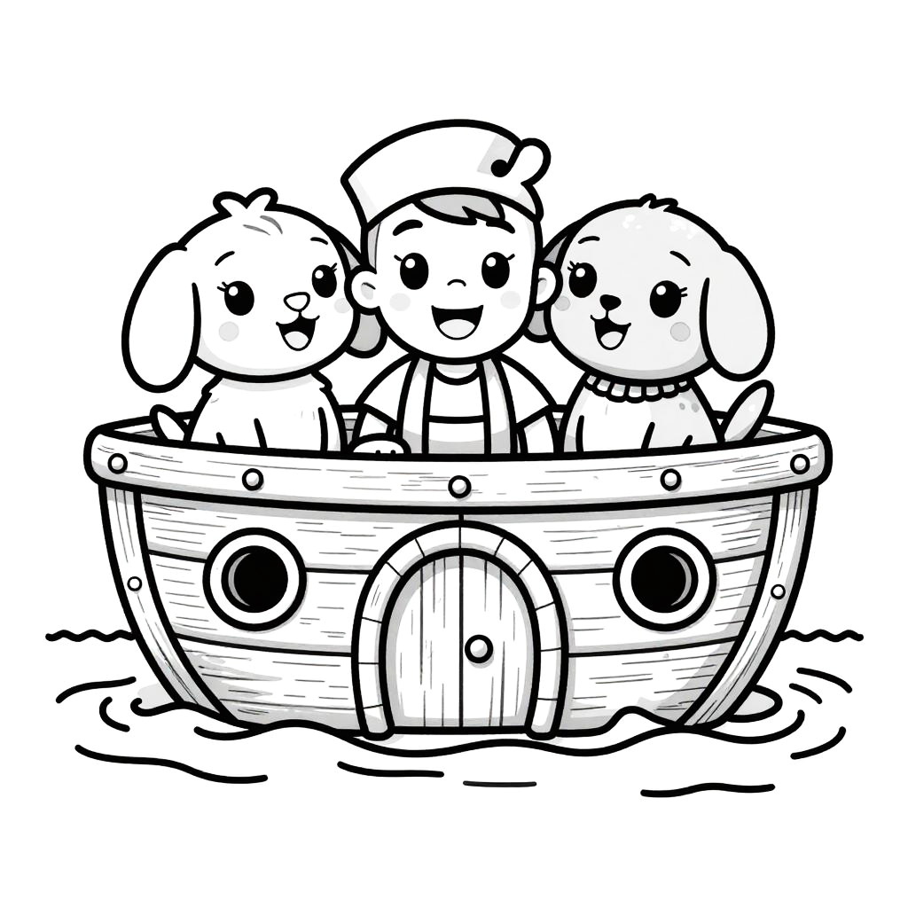 Toddler Noah's Ark coloring page, cute animals boarding a whimsical ark, simple bold outlines for kids, playful clouds and waves, joyful and friendly style