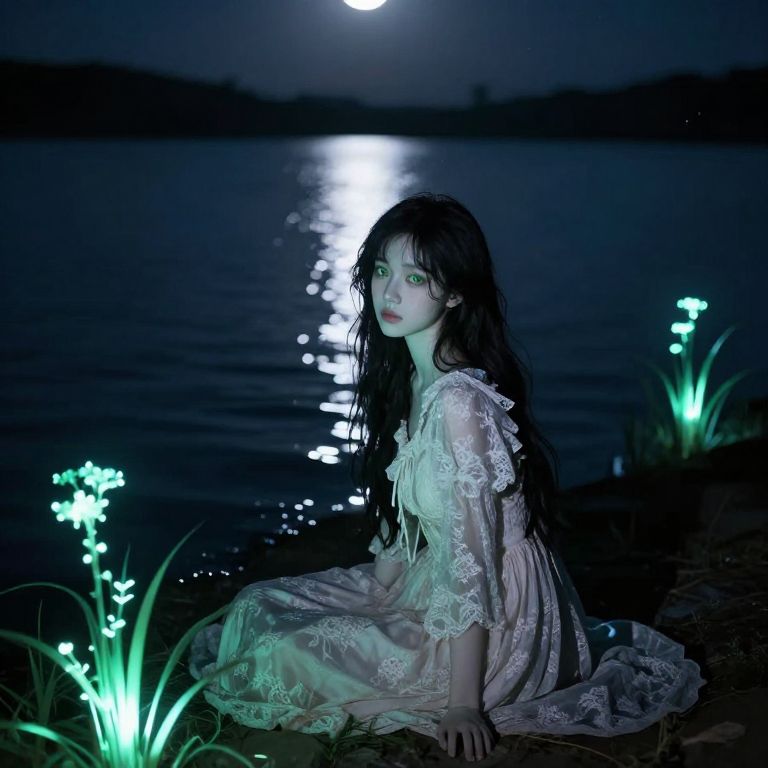 Photograph of a young woman with long black hair, wearing a lace dress, sitting by a moonlit lake, surrounded by glowing flowers.