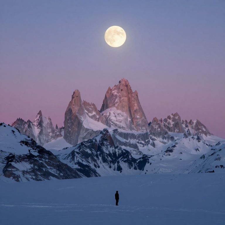 Silent sentinels of jagged peaks stand eternally sharp against the twilight sky, their icy surfaces bathed in the ethereal glow of a luminous full moon, while a solitary figure stands small and contemplative in the vast, desolate expanse below.