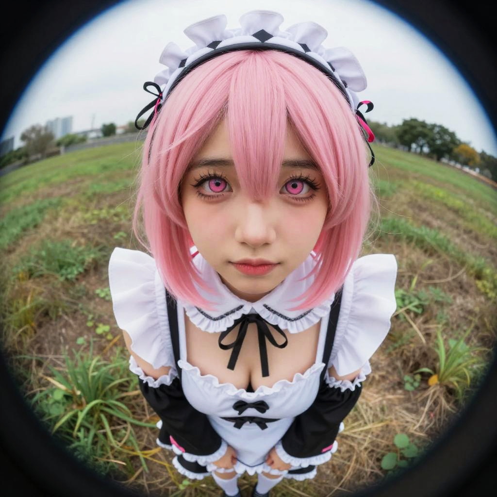 1girl, ultra high quality, ultra high res, masterpiece, realistic, photo-realistic:1.37, best quality, detailed eye makeup, detail face, nice detailed eyes, heavy eye makeup, cleavage, pink hair, maid headdress, maid, pink eyes, white_legwear, (detached_sleeves:1.2), portrait, maid apron, Kpop idol, (aegyo sal:1), natural light, light on face, cinematic lighting, full body, closeup, nsfw, small breast, ram \(re:zero\), (light pink short hair), detailed hands and fingers, nature, scenery, fisheye lense