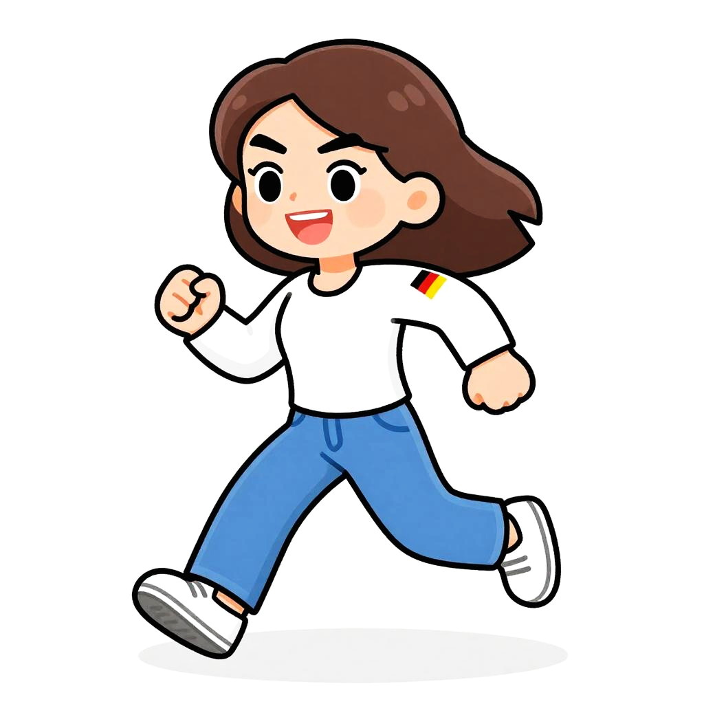 This is a colorful, cartoon-style drawing of a determined-looking woman with brown wavy hair, running with an energetic smile. She's wearing a white long-sleeve shirt with a German flag patch on the sleeve, blue pants, and white shoes. Her right fist is clenched, and her left arm is bent, showing motion. The background is plain white, making her the focal point.