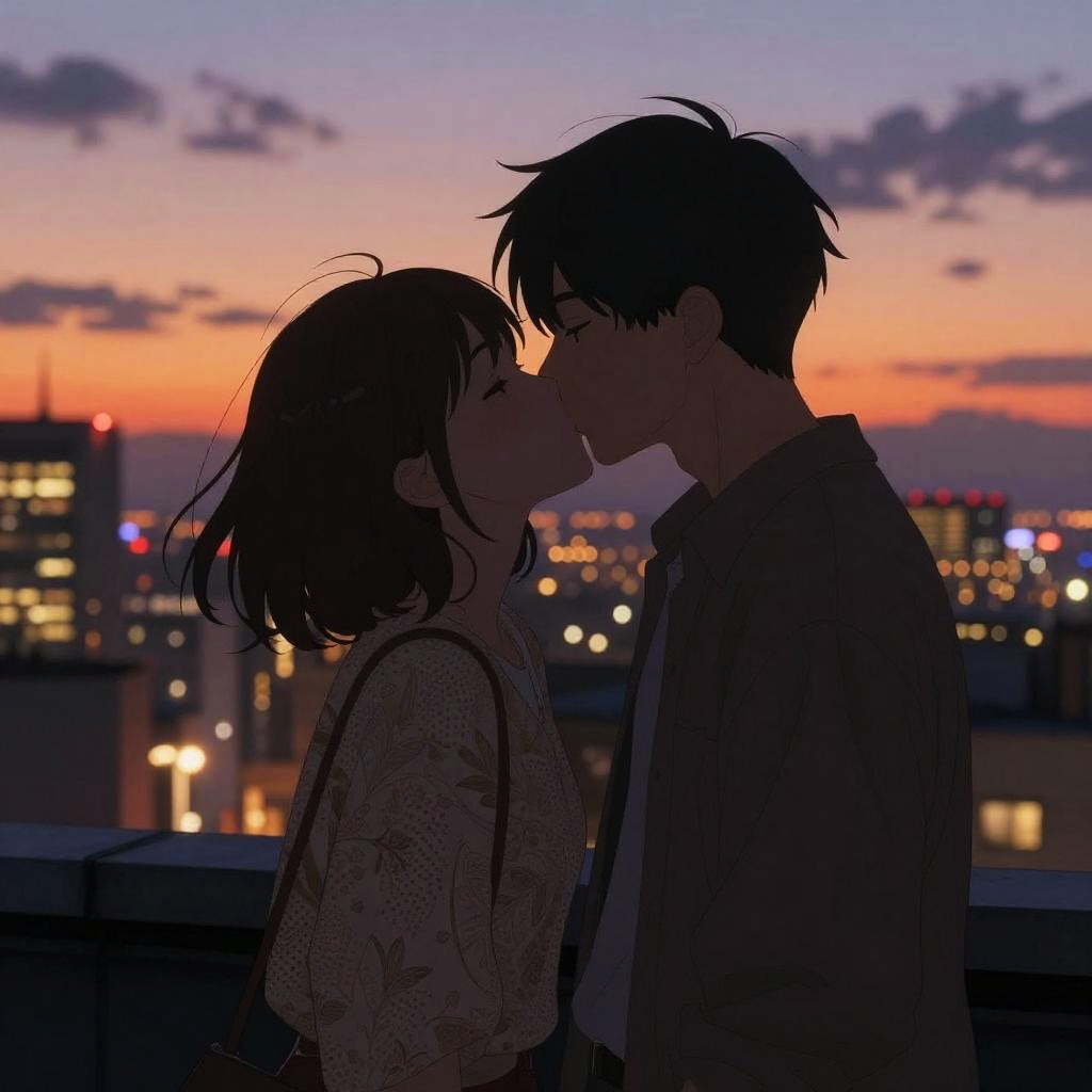 Anime Couple Kissing at Twilight Rooftop
