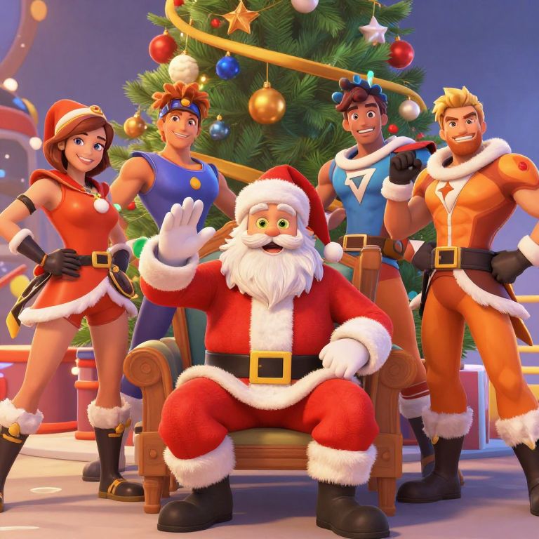 CGI Christmas scene with Santa Claus in a chair, flanked by four muscular, festive-clothed friends, in front of a decorated tree.