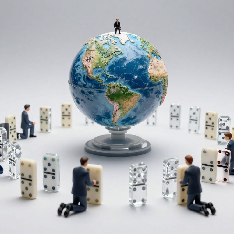 Photograph of a large, detailed globe with colorful continents and oceans, centered on a white background. A tiny, black-suited man stands atop the globe. Surrounding the globe are scattered white dice with black dots, and multiple small, black-suited men kneeling in front of them, each holding a die. The scene is brightly lit with a clean, minimalistic style, emphasizing the contrast between the large globe and the small, figurative men and dice. The background is completely white, focusing attention on the central elements.