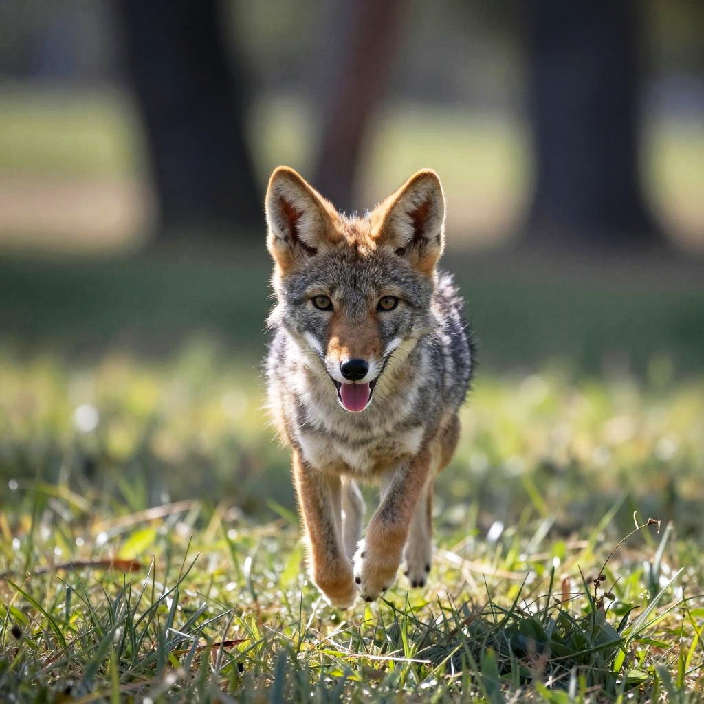 Wildlife Photography 8k photo captured with a high end 80mm lens and a soft focus filter, cool tones, playful coyote pup, small and playful, sandy-gray coat with faint reddish highlights, oversized ears, curious amber eyes, slightly ruffled fur, mid-leap with tongue out, sunlit grass and dappled light enjoying a sunny day at the park, tall trees and green grass in the background, natural light should illuminate the scene, with a gentle fill flash to accentuate the dog's features,