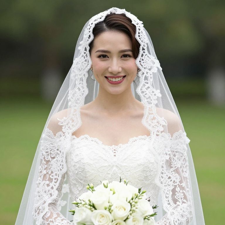Photograph of an Asian bride with fair skin, dark hair styled in an elegant updo, wearing a white lace wedding dress with a deep neckline and intricate lace sleeves. She has a bright red lipstick smile and is adorned with a long, lace veil that drapes over her shoulders. She holds a bouquet of white flowers in both hands. The background is a blurred green outdoor setting, indicating a garden or park. The overall image has a soft, slightly overexposed look, emphasizing the bride's radiant smile and white lace details.