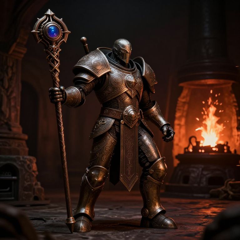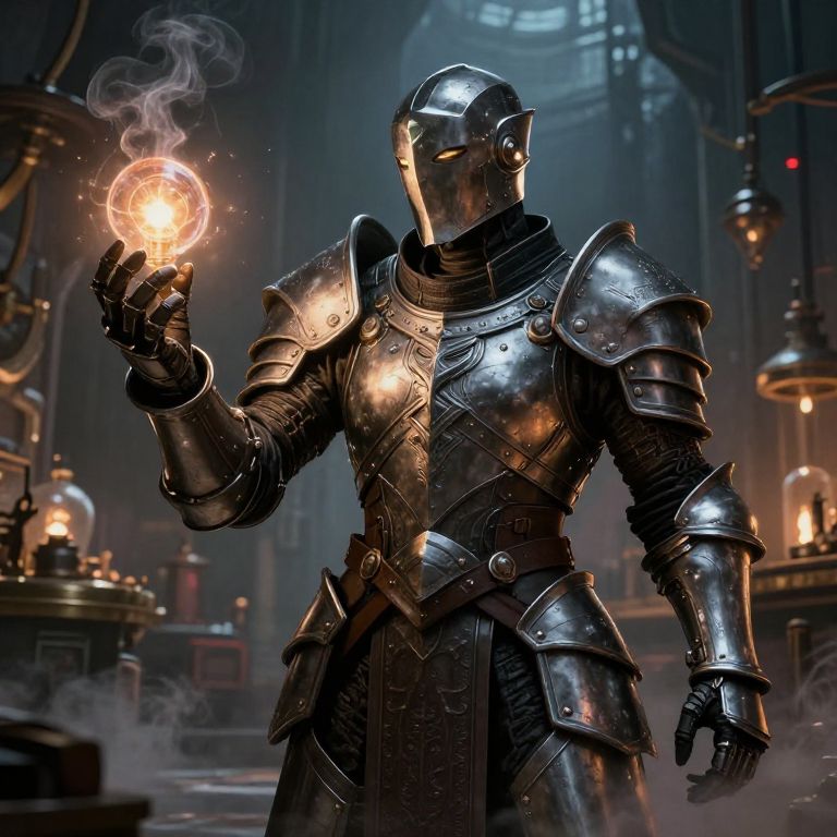 Dnd warforged artificer in detailed steampunk armor, surrounded by glowing magical gadgets, intricate gears and arcane symbols, workshop background, cinematic lighting