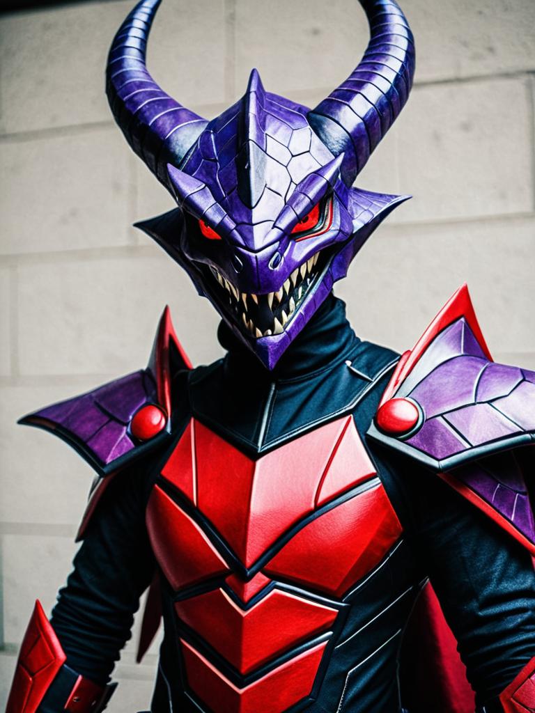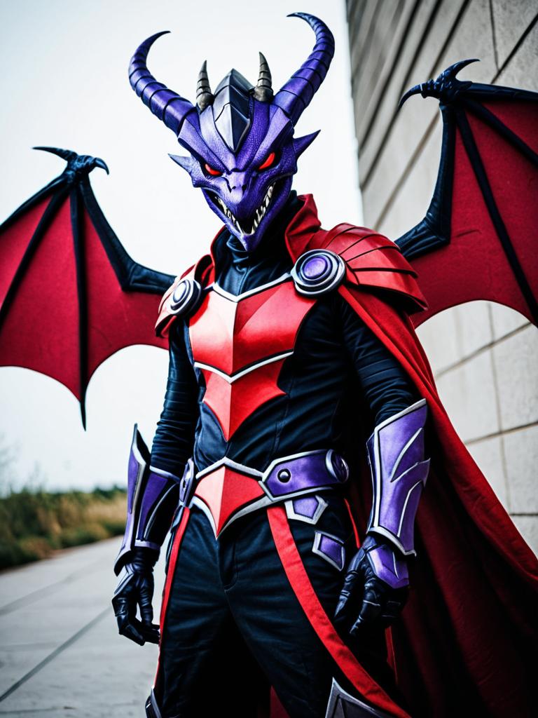 A man dressed in a detailed Cynder (Legends) cosplay costume featuring a purple and red armored suit with a menacing dragon-like helmet with large curved horns and sharp teeth. The costume includes intricate armor plating on the shoulders, chest, and arms, creating a realistic and striking fantasy character look. The background is a neutral beige wall.