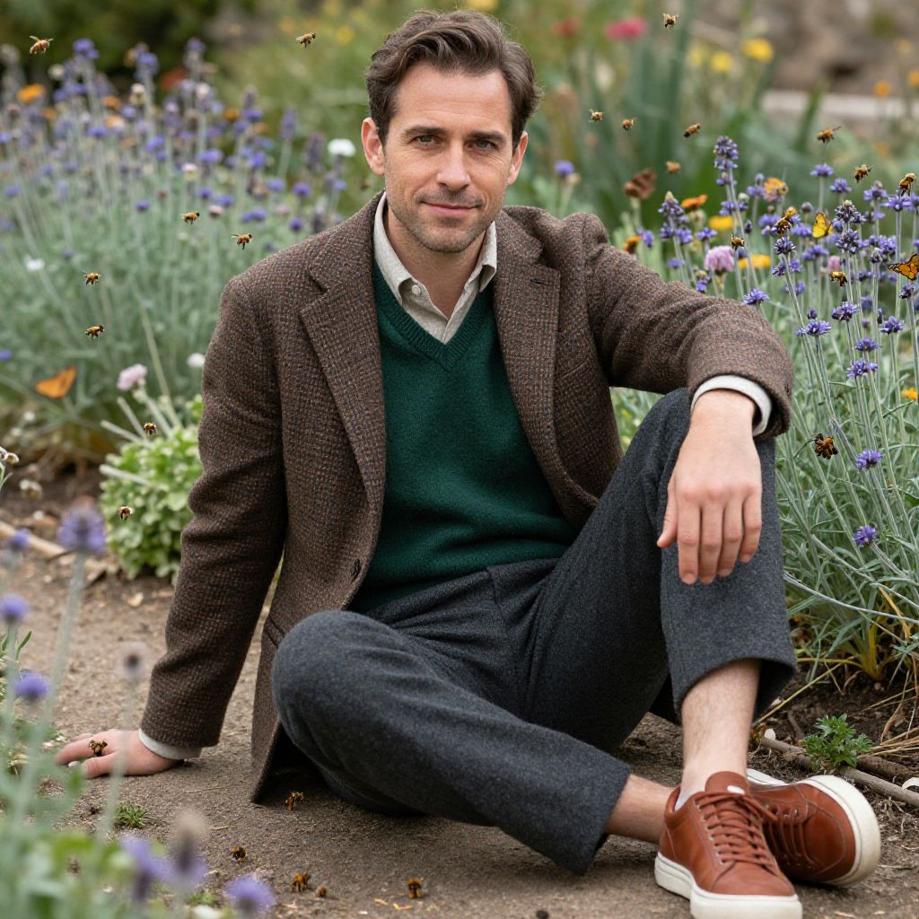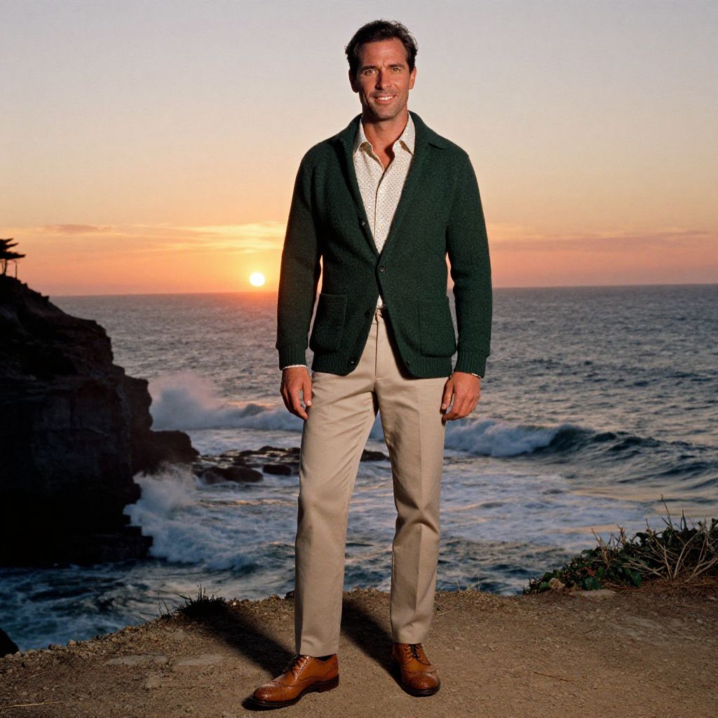 A man, pale pink dress shirt, navy tweed vest, beige dress pants, dark brown brogues, matching brown belt, artisan craft stalls, warm sunset glow, AgfaColor film, relaxed smile, soft lighting. Man has masculine face and piercing eyes