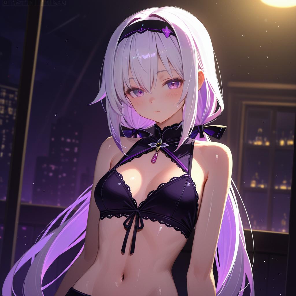 Digital artwork of an anime-style young woman with long purple hair and purple eyes, wearing a black headband and black lace lingerie. The character has small breasts and is depicted indoors with a cityscape visible through a window in the background. The lighting creates a soft glow around her, emphasizing her detailed features and gentle expression.