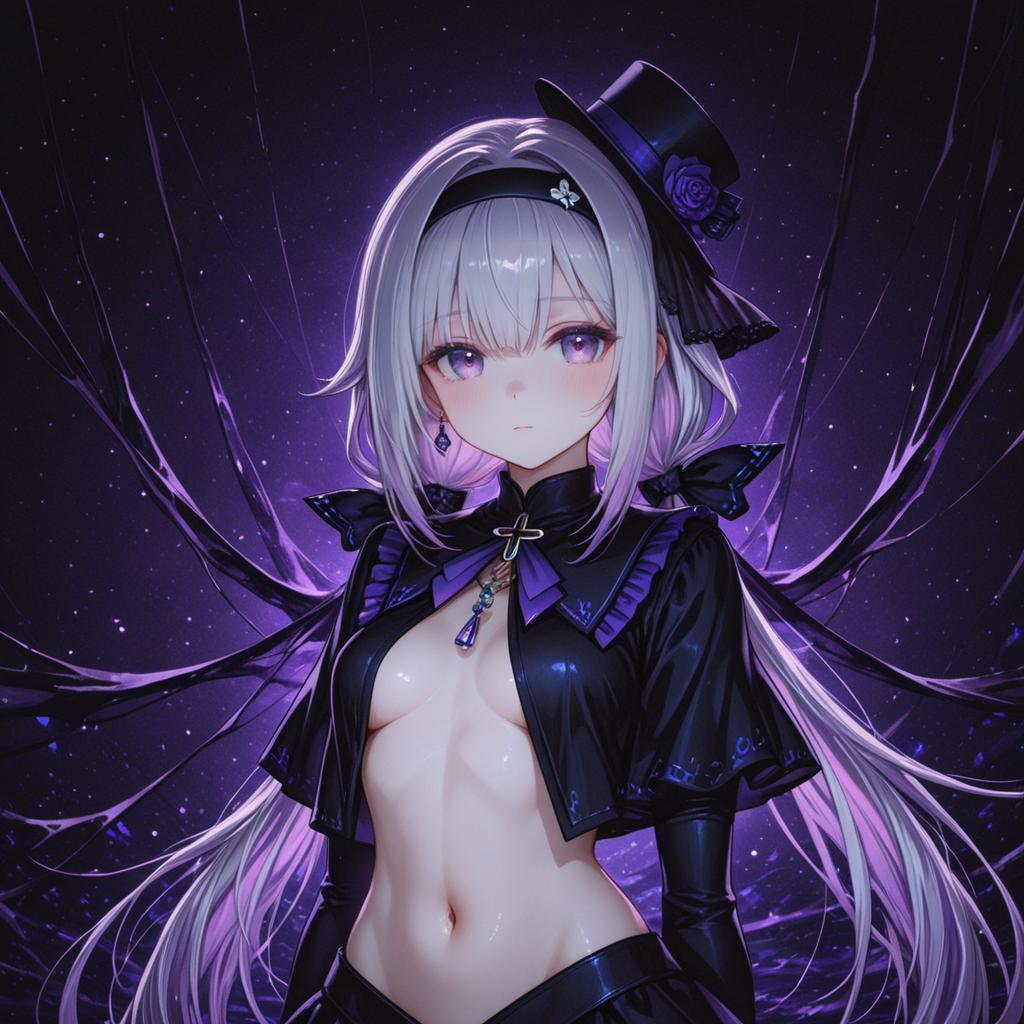 Carro pino, .live, 1girl, purple eyes, hair between eyes, purple hair, long hair, low twintails, small breasts, navel, virtual youtuber, virtual youtuber, headband, by artist tostantan, dark_illustrious