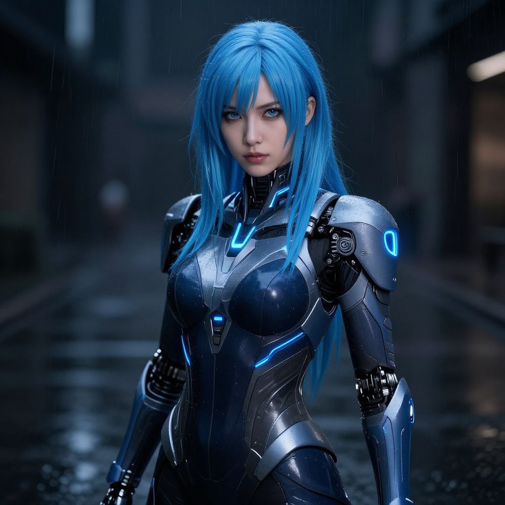 Female blue hair costume, sleek futuristic armor, angular design with glowing blue accents matching hair, dark urban environment with rain and reflections, cybernetic enhancements visible, intense expression, high detail sci-fi digital artwork