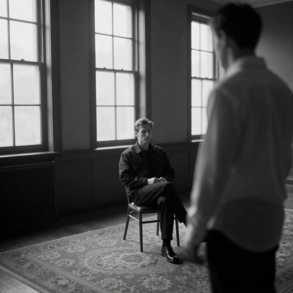 Black and white photograph featuring a man with short hair and a dark jacket sitting on a chair in a dimly lit room with tall windows and textured walls. Another man with short hair, wearing a light shirt, stands in the foreground, partially turned away. The room has a patterned rug and soft natural light casting shadows through the windows.
