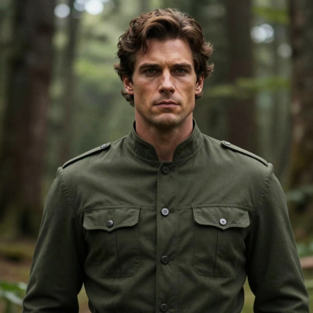 (absurdres, highres, ultra detailed, realistic), (1 male, solo, adult, mature, aged up, tall muscular guy, broad shoulders, handsome), wavy brown hair, green eyes, (angular jaw, thick neck, thick eyebrows), , forest, fantasy, Uniform, extremely detailed face, upper body