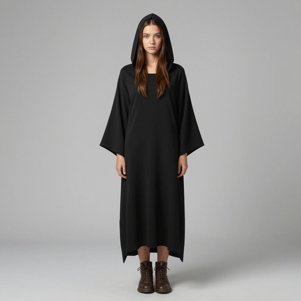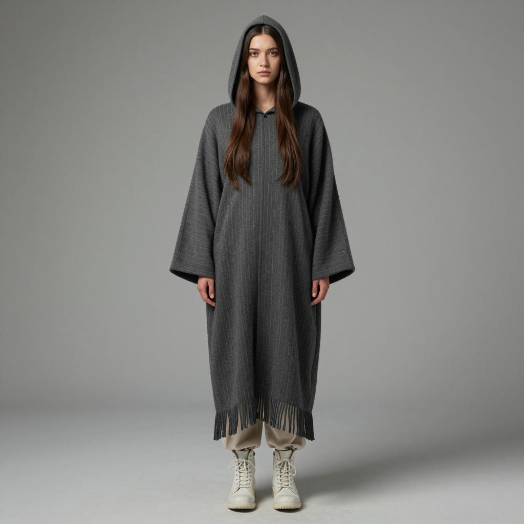 Drip costume, photorealistic portrait of young woman, standing, full body, wearing long, loose, dark gray hooded robe with vertical stripes and fringed bottom, light beige pants, white lace-up boots, long straight brown hair, serious expression, neutral gray background, soft lighting, minimalist, contemporary fashion, realistic ures, muted colors, simple background, standing pose, full frontal view