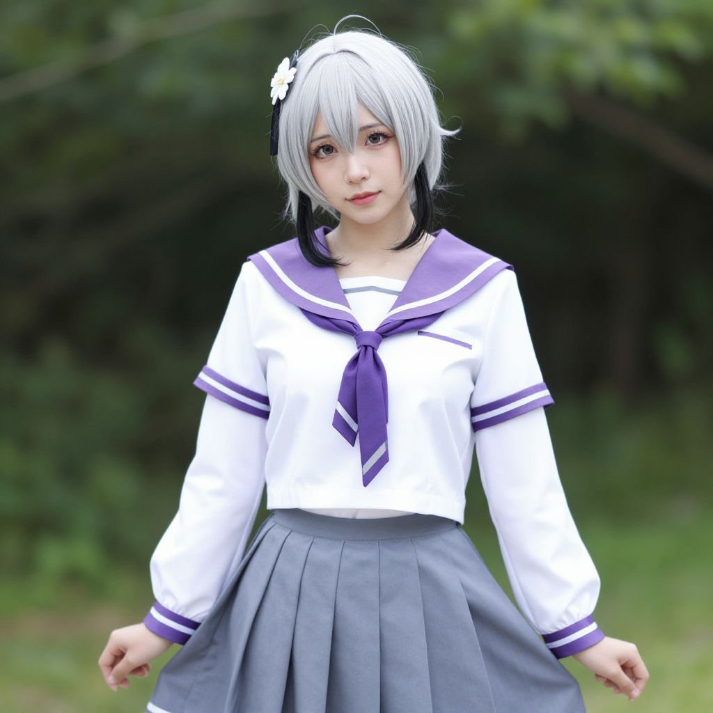 Digital anime-style photograph of a young girl with white and black hair, wearing a white sailor uniform with purple trim and a grey pleated skirt, standing