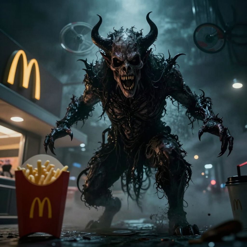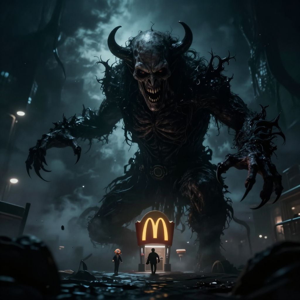 The demon of McDonald's restaurants! Terrifying horror photograph, Dramatic Getty Images, gloomy, dark, psychologically unsettling, and frightening. :(breathtaking, detailed, expansive, photorealistic ultra high definition, highest quality, ultrarealistic), perfect composition, dramatic action, sharp focus, intricate details, highly detailed, experimental angles, terrifying experimental lighting, disturbinh cinematic horror, fear invoking, Zeiss Master Prime Lenses, Panavision, Film Stock Footage, with a Nikon Z 14-30mm f/4 lens at 30mm. 10 seconds, f/5.6, ISO 6400, Cinematic photograp, magnificent, ethereal, epic, terror inspiring, motion blur