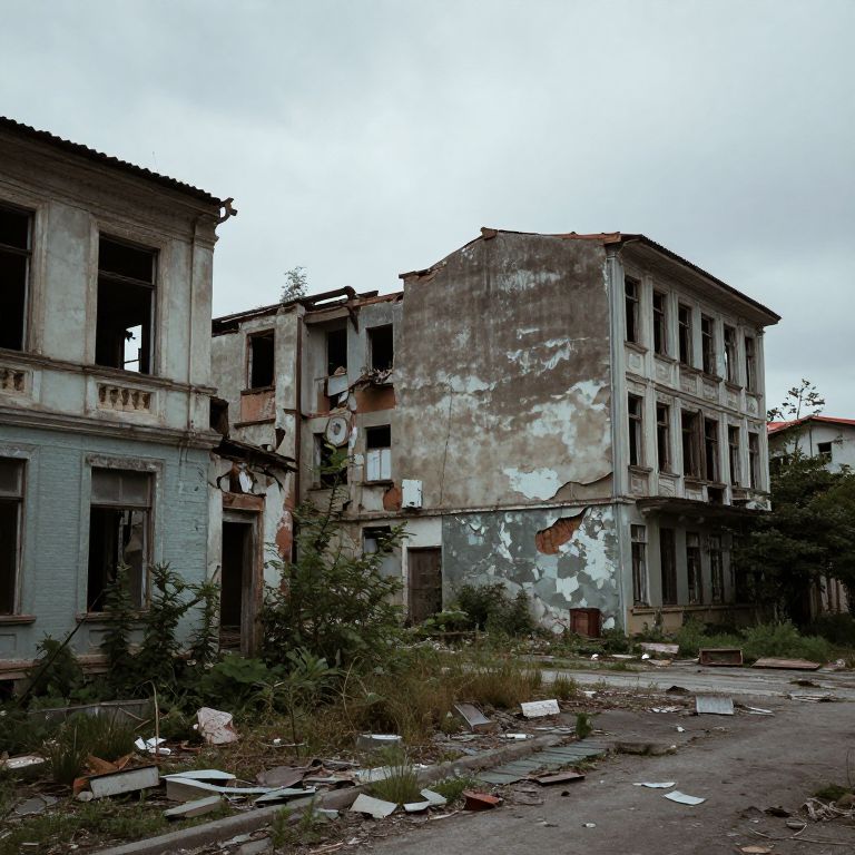 In a city where time whispers secrets of decay, abandoned structures stand as silent witnesses to the relentless march of entropy, their crumbling facades mirroring the weight of forgotten dreams and the quiet melancholy of a world left behind.