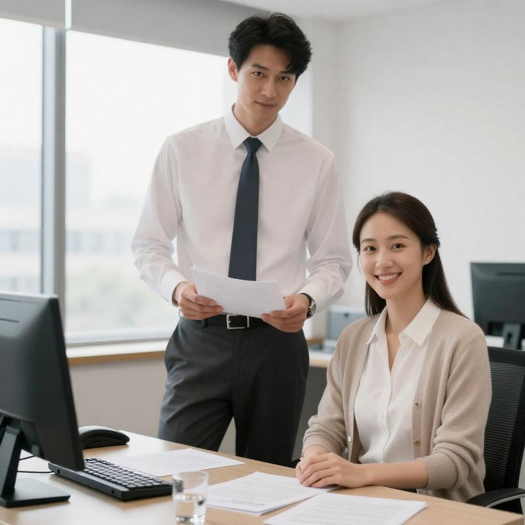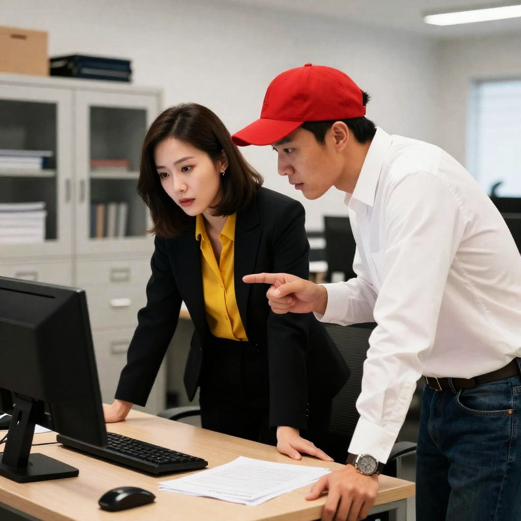 Photograph of a business meeting. Six men, one woman, brown-haired woman in green blouse and white pants standing, others in suits. Conference table with documents, laptops, green table runner, red flowers. Guitar paintings on wall, "Merry Christmas" sign. Woman smiles, men focus on documents. Two men with intense expressions. Casual office setting.