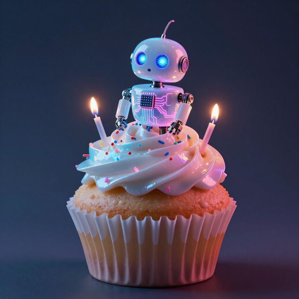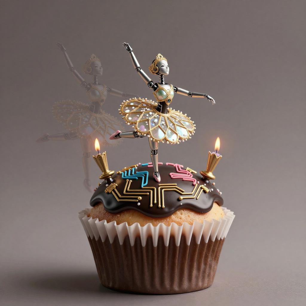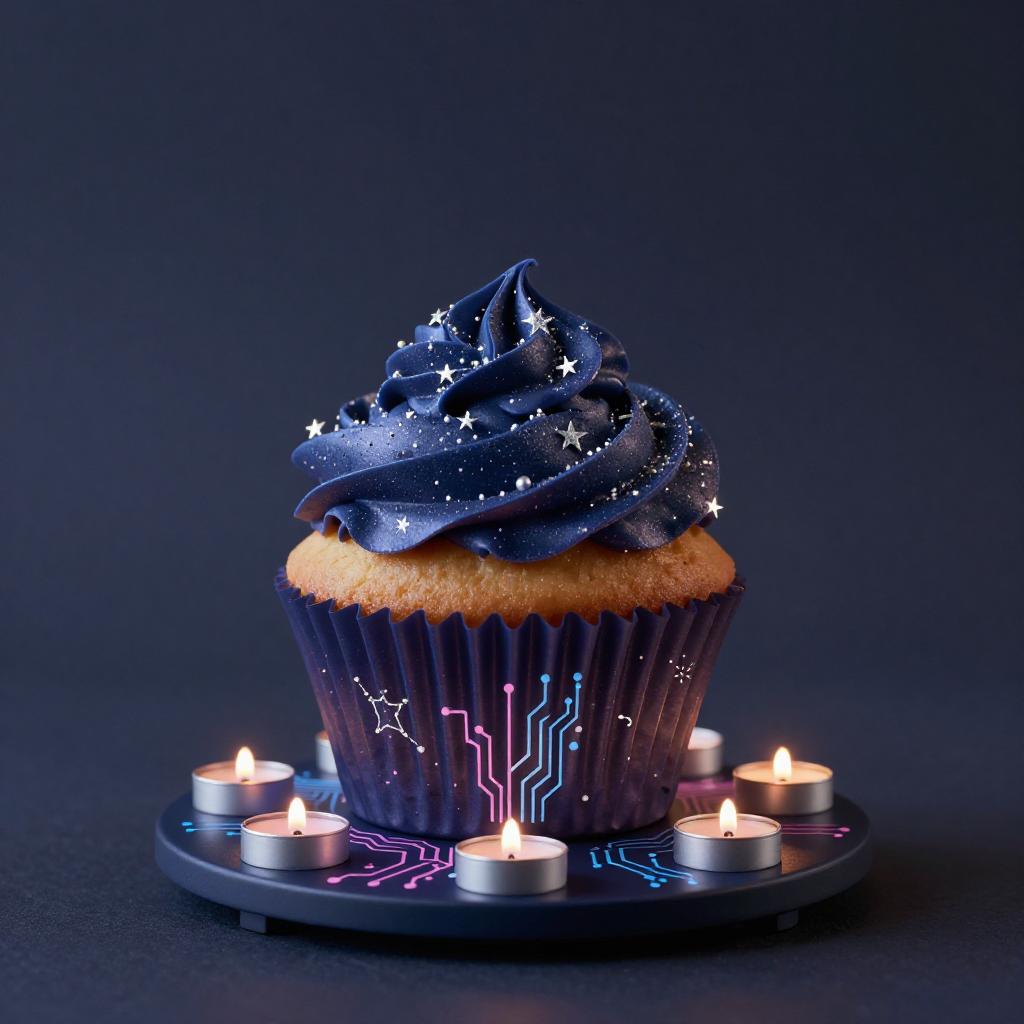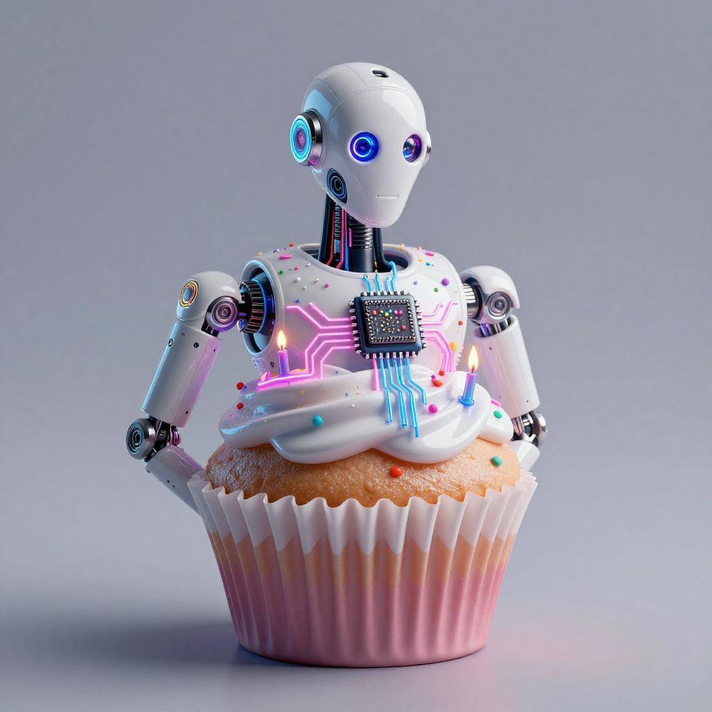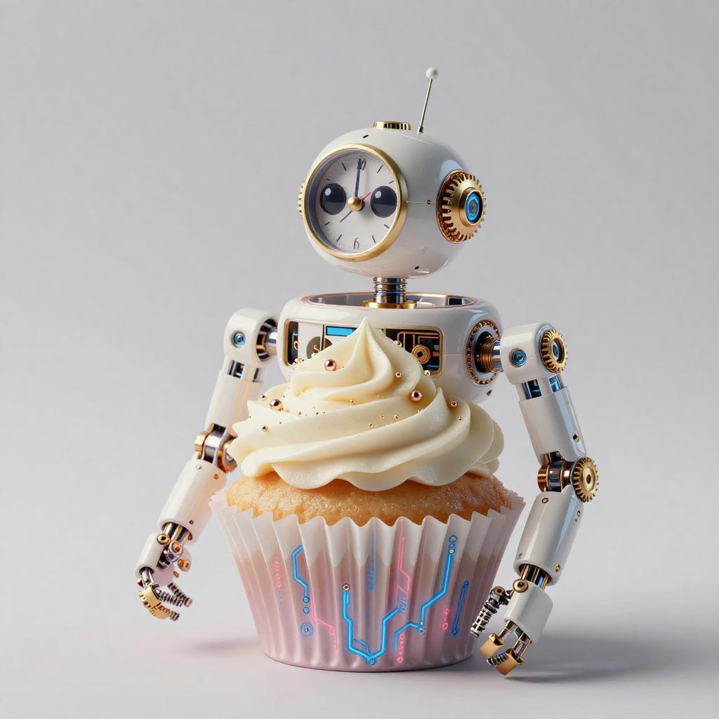 A high quality digital art of a Cupcake bioluminescent jellyfish automaton, translucent jelly-glaze frosting with bioluminescent pearl LEDs and holographic circuit-sprinkles, pink and blue circuits, double exposure, up close portrait, (double exposure:1.05), elegant theme, octane render, droid, concept photo, 8k, cinematic lighting, negative space, beautiful lighting, product picture