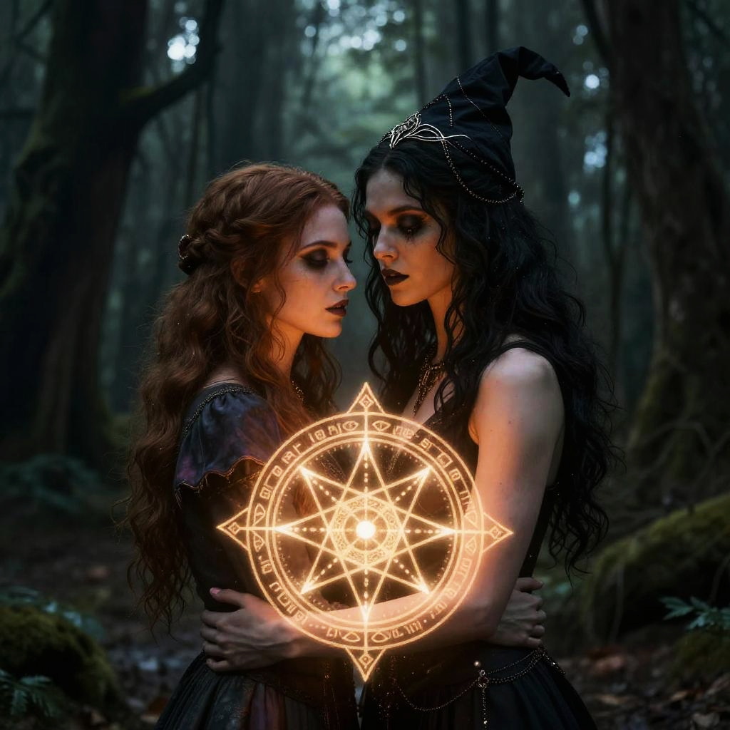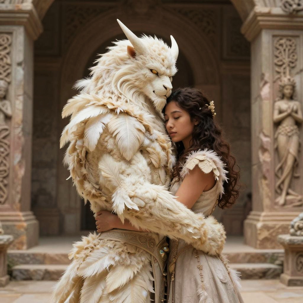 Diamond golem embracing a realistic forest nymph, glittering crystal cave background, reflective gemstone facets, sleek, bright tones, fantasy