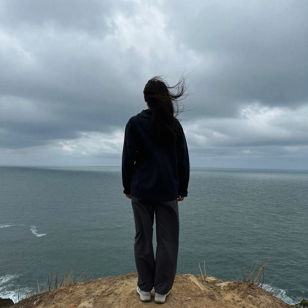Person facing backwards standing on a cliff edge overlooking the ocean, wind blowing through long hair, dramatic clouds overhead, sense of freedom and solitude