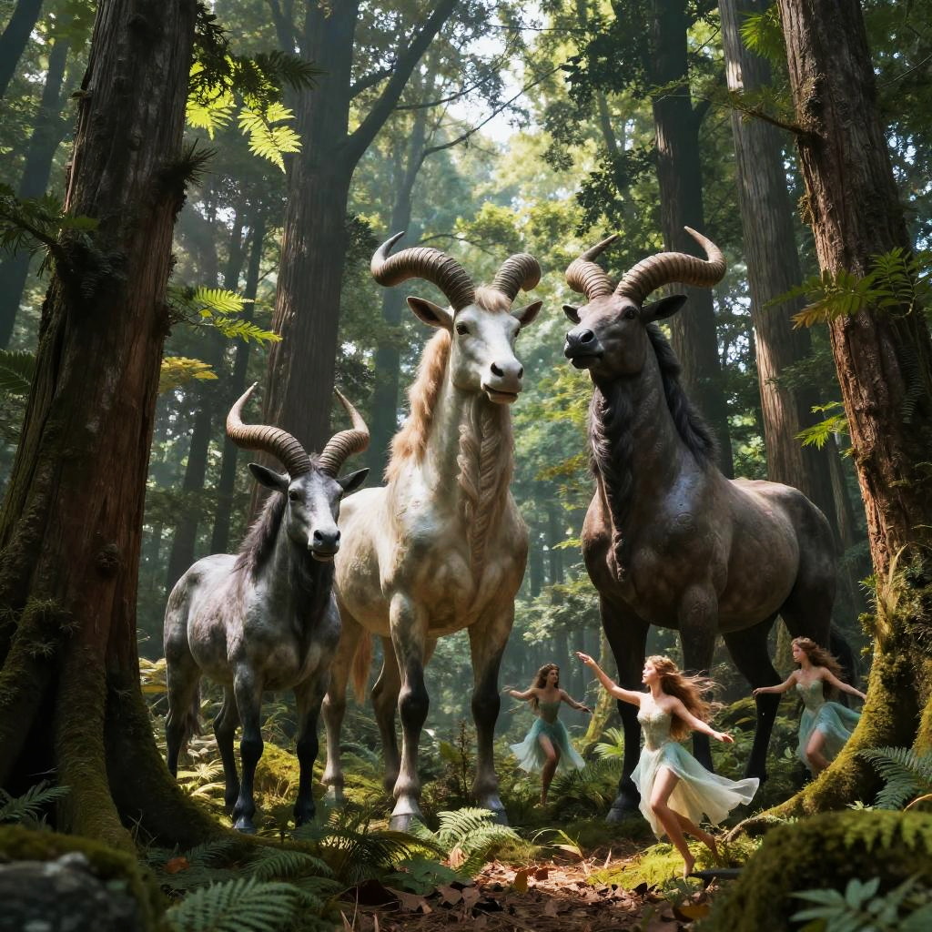 Mythical creatures in the forest, towering centaurs blending with towering ancient trees, nature spirits dancing in the shimmering sunlight, surreal and magical woodland environment